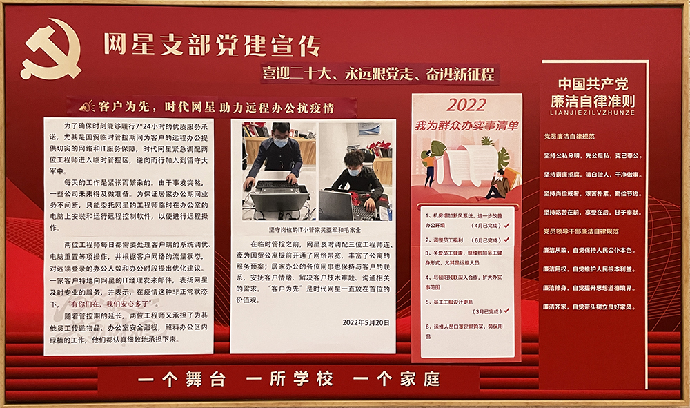 在上半年的各項工作中,網(wǎng)星支部始終沖在廣大員工的最前列,支部主要領導一手抓好疫情防控,一手抓經(jīng)營管理,使公司的各項工作始終保持平穩(wěn)有序運行。5月3日面對突然而至的國貿(mào)臨時管控,時代網(wǎng)星領導班子緊急召開會議,確定并啟動應急方案。技術部立即摸排所有技術人員情況,調(diào)配吳亞軍和毛家全兩位技術人員及時進駐網(wǎng)星主控機房進行7*24小時值班,同時負責及時處理國貿(mào)區(qū)域內(nèi)近千家客戶的IT和網(wǎng)絡需求。由于事發(fā)突然,許多客戶來不及準備,只能委托網(wǎng)星的工程師在客戶端安裝遠程控制軟件,實現(xiàn)居家辦公遠程操控。兩位工程師每日都要處理客戶端的系統(tǒng)調(diào)優(yōu)、設備監(jiān)控和重置等操作,并根據(jù)客戶的網(wǎng)絡流量對遠端登錄的辦公人數(shù)和辦公時段提供專業(yè)的優(yōu)化建議。網(wǎng)星的工作得到了廣大客戶的充分肯定,有客戶特地發(fā)來郵件表示感謝,稱“有你們在,我們安心多了”。