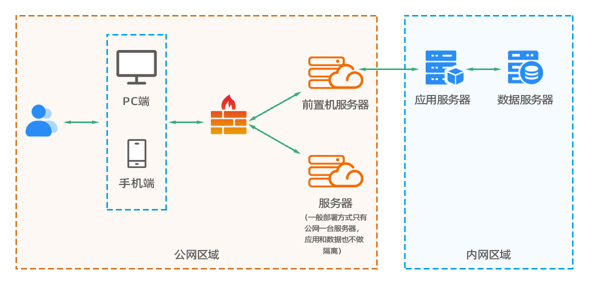 系統(tǒng)部署采用公網(wǎng)前置機加內(nèi)網(wǎng)應(yīng)用服務(wù)器和數(shù)據(jù)庫服務(wù)器的方式,服務(wù)器運維操作需要登錄VPN,使內(nèi)網(wǎng)服務(wù)器可以免受網(wǎng)絡(luò)攻擊,核心數(shù)據(jù)得到安全保障(如下圖所示)。